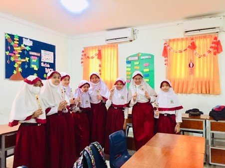 Gambar 2. Biana, siswa kelas VI berbagi kebahagiaan dengan membagikan oleh-oleh kepada teman-teman sekelasnya, sepulang liburan dati Thailand